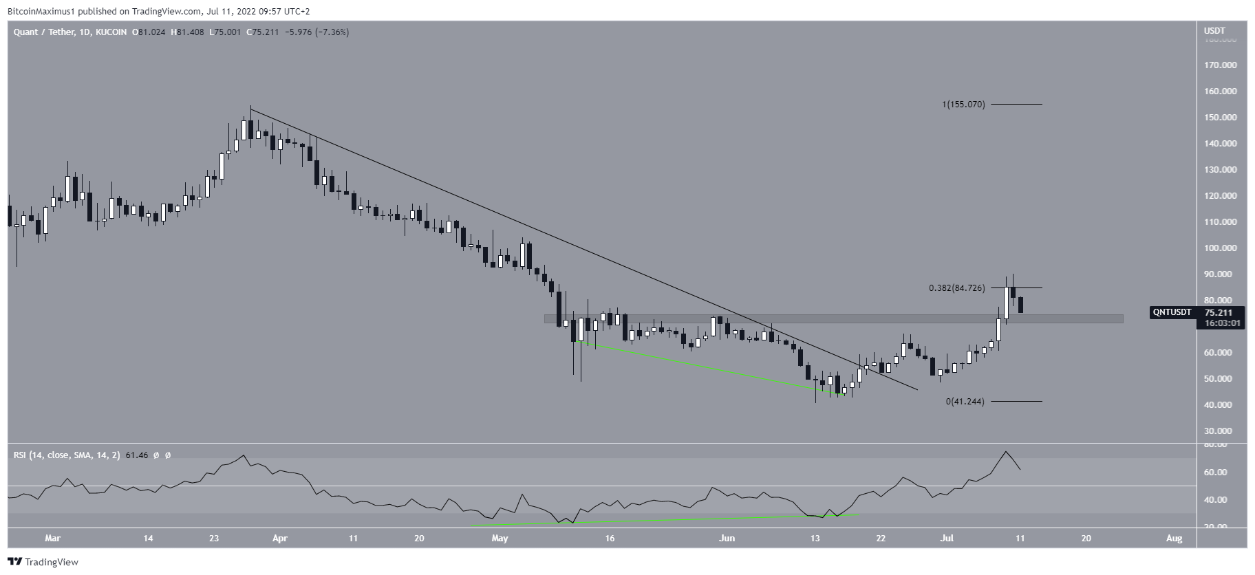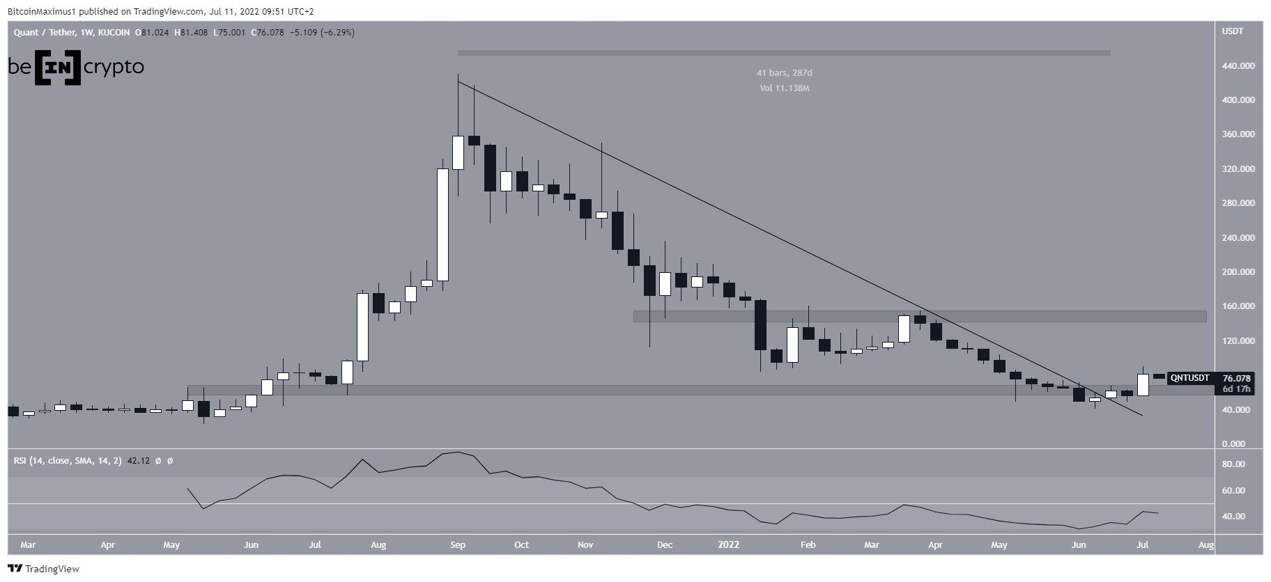 QNT has been decreasing underneath a descending line since Sept, when it reached an all-time high price of $420. So far, it reached a low of $40 last month.