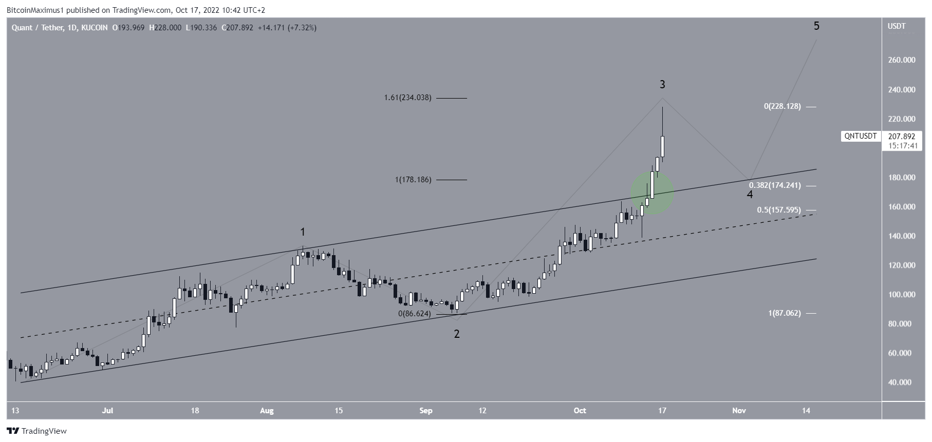 So, the QNT price is expected to complete a fourth wave pullback between the 0.382 and 0.5 Fib retracement support levels at $174.2 to $157.6.