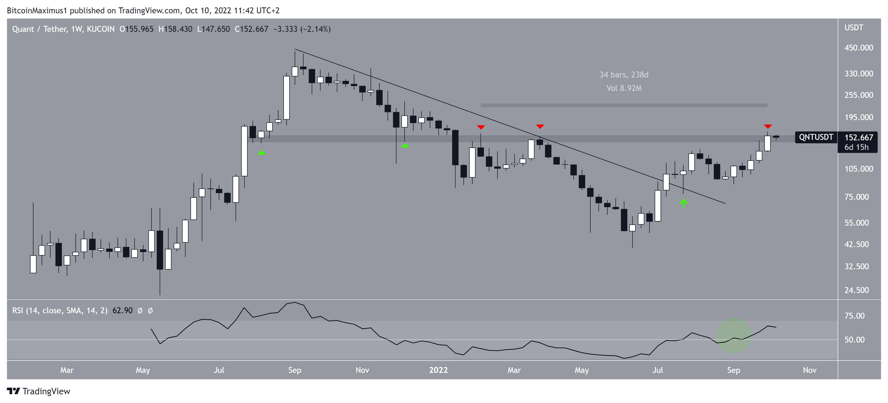 QNT has been one of the strongest movers in the crypto market over the past five months. Since its $40 low in June, the price has created eleven non-consecutive bullish weekly candlesticks.