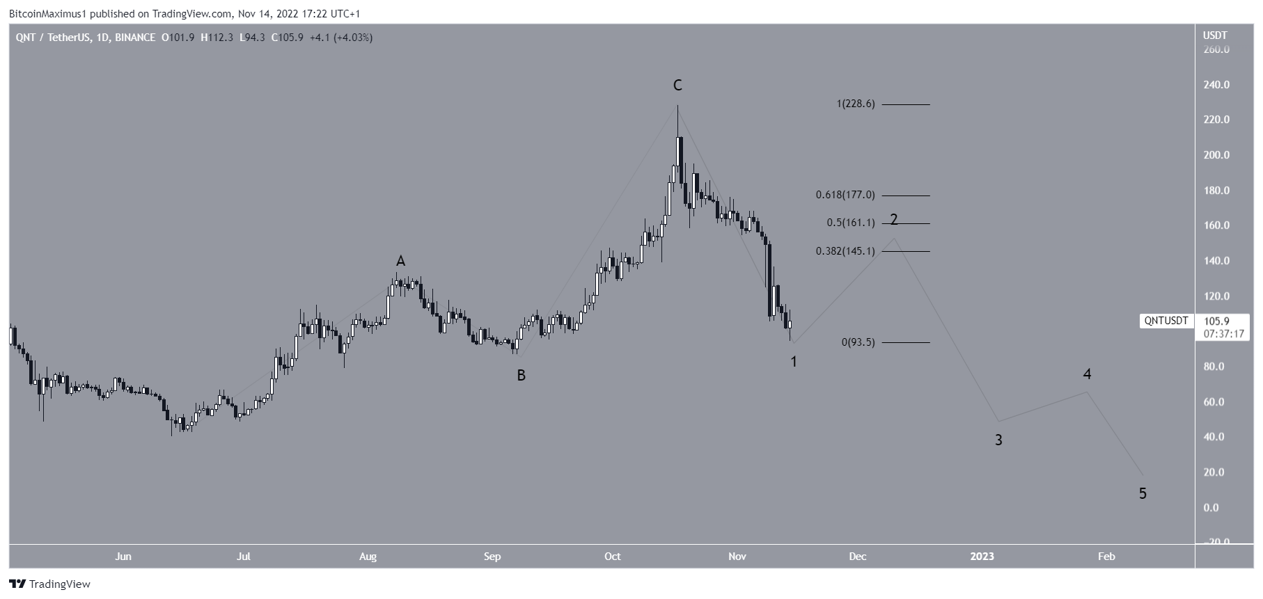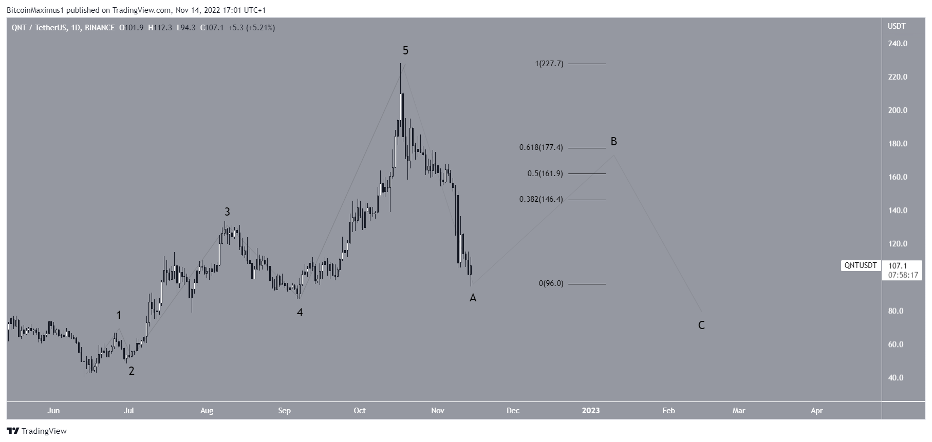 The bearish count suggests that the Quant crypto price completed an A-B-C structure instead and has now begun a bearish impulse.