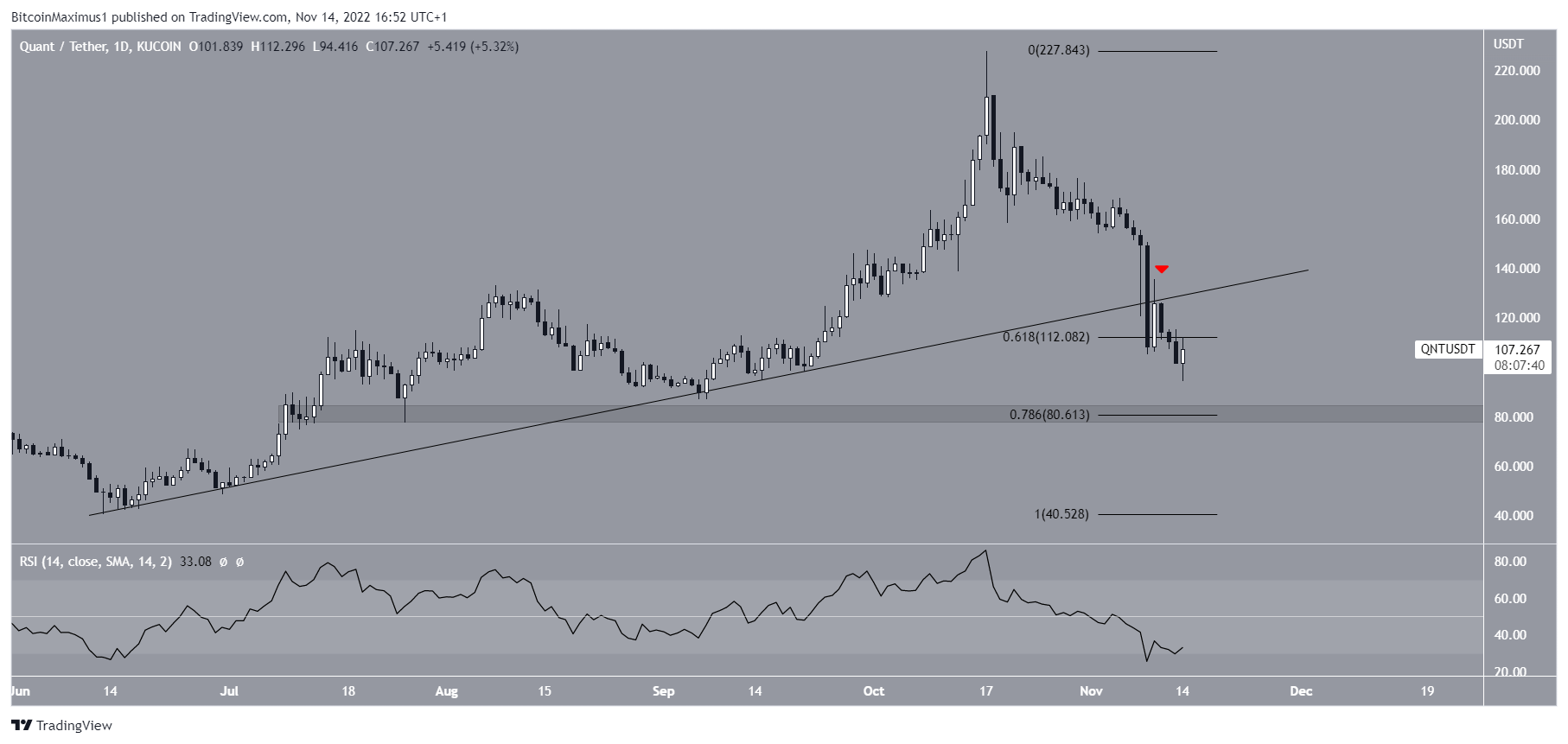 The technical analysis from the daily time frame is bearish. It shows that the Quant crypto broke down from an ascending support line on Nov. 9. Afterward, it validated it as resistance the next day.