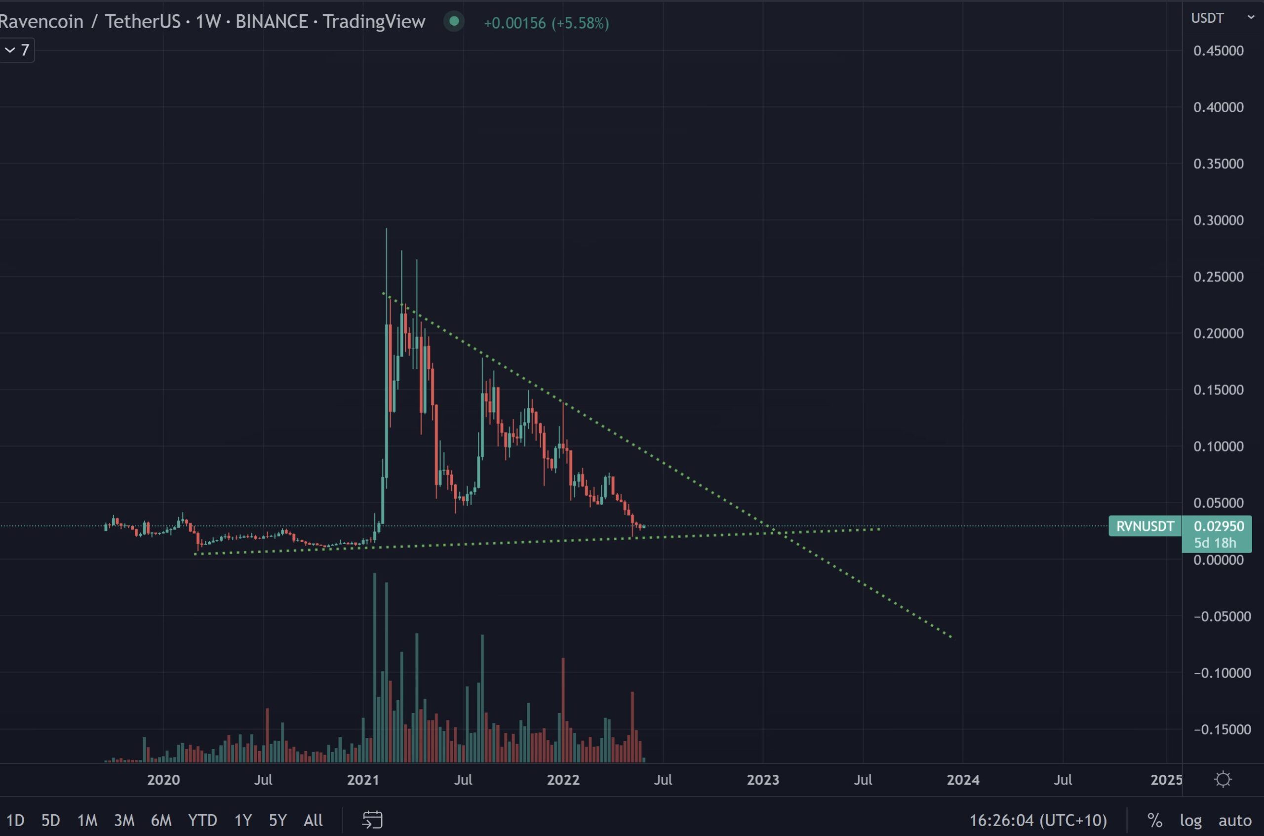 Cryptocurrency trader @bitcoinmanbear1 tweeted a chart of RVN which shows a very long-term symmetrical triangle in place. Both the resistance and support lines coincide with those drawn in the previous image.