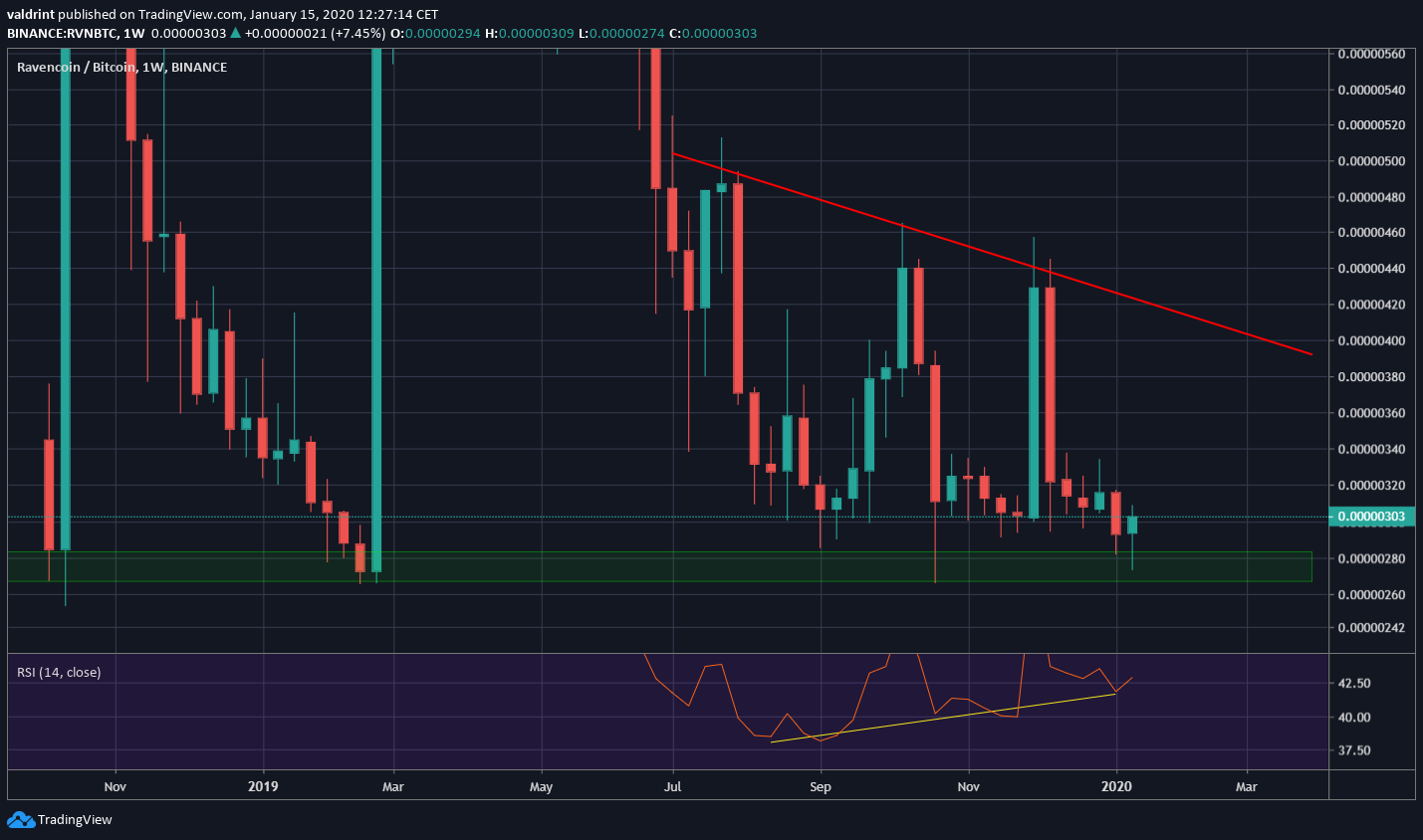 In addition, there is a very strong bullish divergence developing in the weekly RSI. However, instead of the resistance area at 440 satoshis, we think the RVN price is following a descending resistance line. The line is currently near 400 satoshis, making that a more likely target for the ensuing upward move.