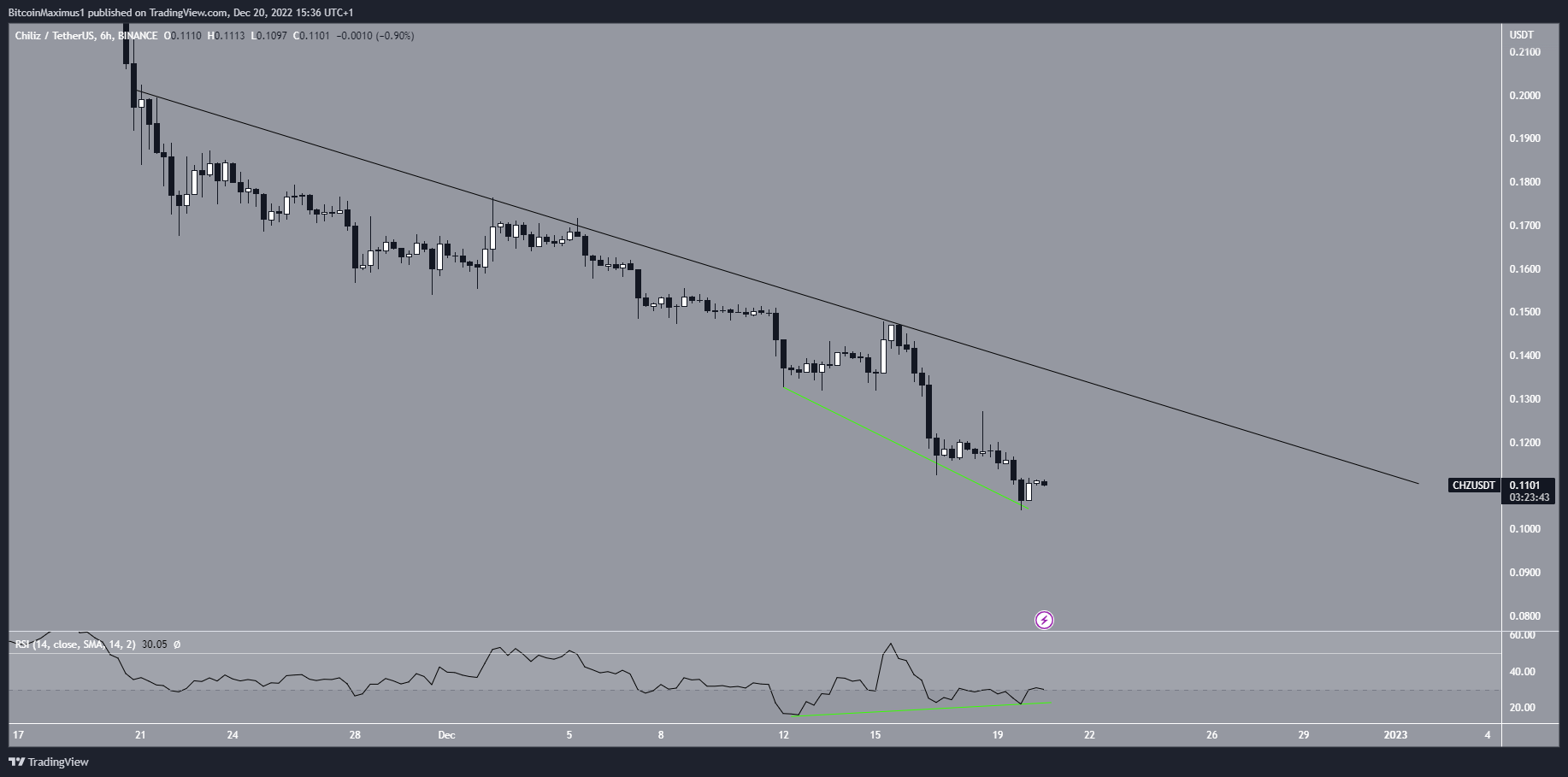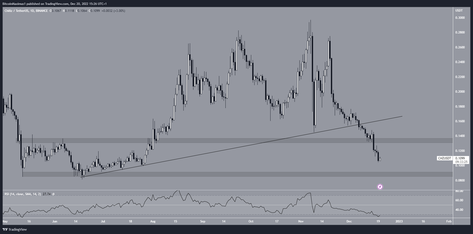 To conclude, while a short-term rally could occur, the most likely CHZ price forecast suggests an eventual drop toward $0.088 will transpire. Breaking out from the short-term descending resistance line and reclaiming the $0.133 area would invalidate this bearish projection.