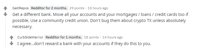 Another Reddit member, Rounder057, commiserated with pm-os, revealing that their credit union had similarly blocked them from purchasing cryptocurrencies.