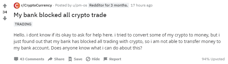 Reddit member pm-os has run into a brick wall with their bank and has turned to the forum for help. According to the thread, this user attempted to convert cryptocurrencies to fiat but was in for a rude awakening. The bank apparently âblocked all trading with crypto,â leaving pm-os unable to âtransfer moneyâ to their bank account.