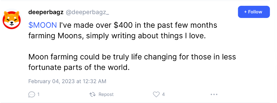 Another user allegedly made $400 in MOONs over the span of a few months by writing relatable Reddit posts: