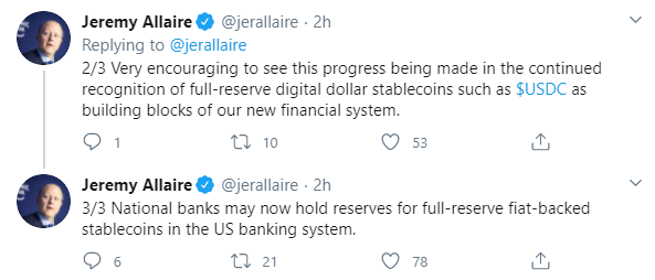 The cryptocurrency community was quick to cheer the endorsement. Circle CEO Jeremy Allaire called the development āvery encouraging,ā saying in a tweet,