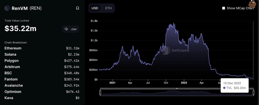 According to data from DefiLlama, the Ren Protocol has over $35 million in Total Value Locked (TVL), which consists of over $31 million in the Ethereum network.Â