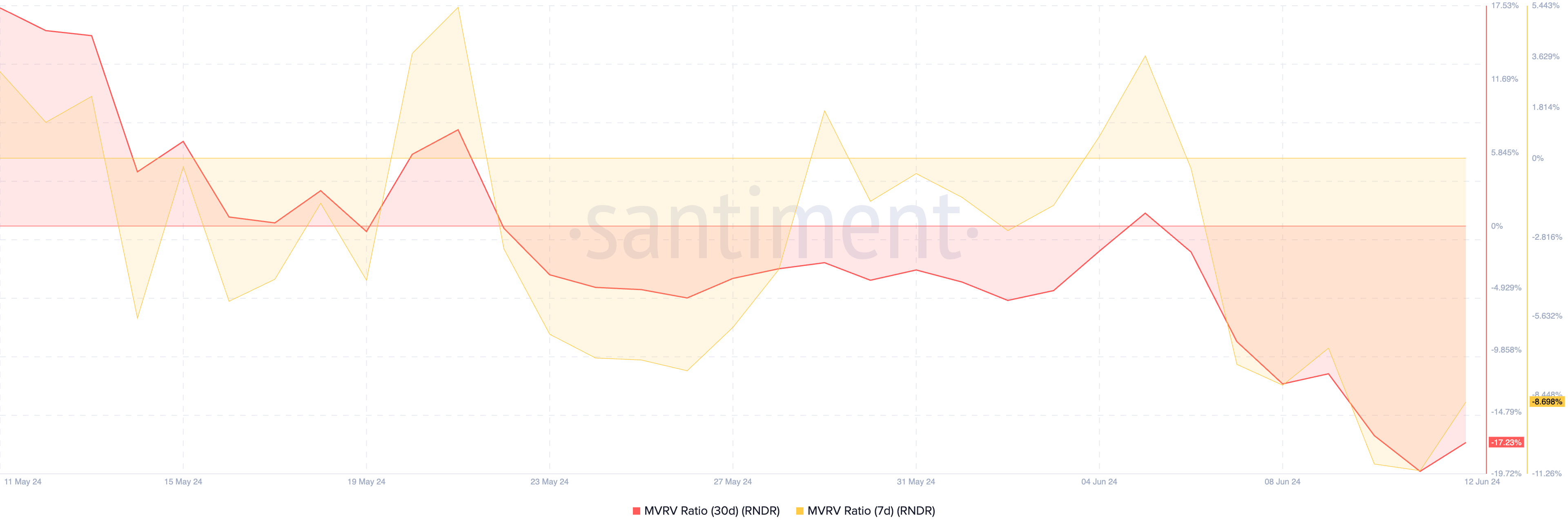 RNDR’s MVRV ratio, assessed over the 7-day and 30-day moving averages, returned negative values of -8.6% and -17.23%, respectively.