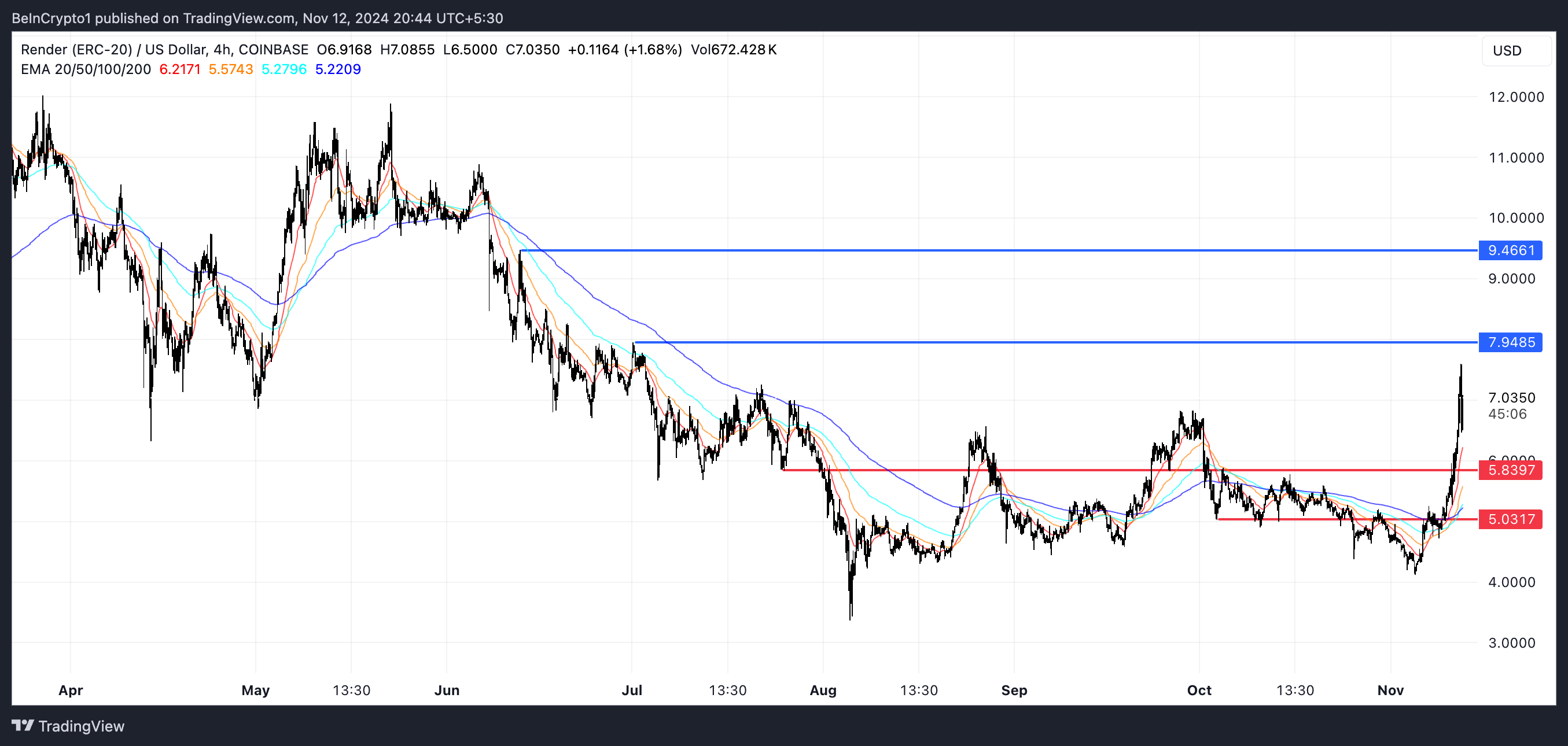 However, if the uptrend loses momentum and reverses, RNDR could fall back to the support at $5.83. Should that level fail to hold, the price could drop further to $5.03, signaling a deeper correction.