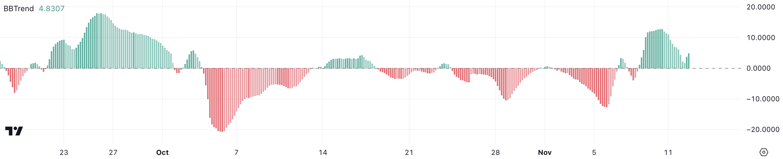 Render BBTrend has remained positive since November 8, reaching a monthly high of 12.7 on November 10. BBTrend, or Bollinger Band Trend, is an indicator that measures momentum in relation to Bollinger Bands.