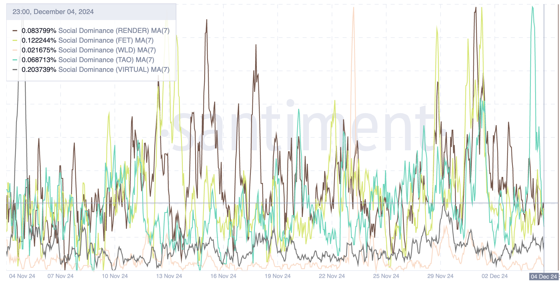 While it trails FET and remains well behind VIRTUAL, both of which have seen increasing social attention in recent weeks, RENDER strong market presence ensures it remains a key player in the artificial intelligence space.