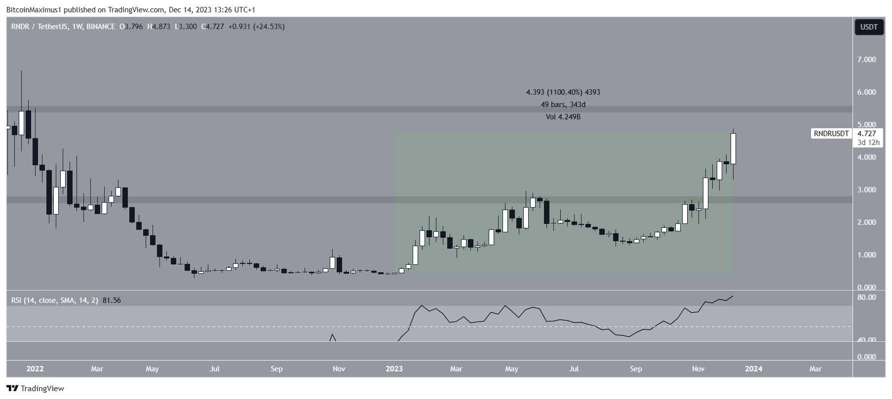 The RNDR price has experienced a significant bullish run this year. Since January, the price has increased by 1,100%, culminating with a new yearly high of $4.87 today. This is the highest price in more than 700 days.