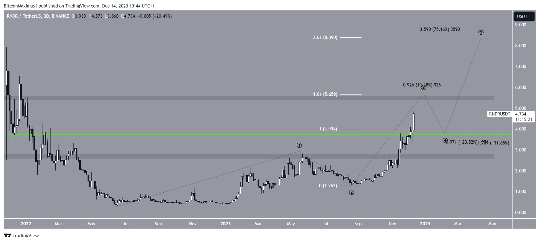 The most likely wave count suggests that RNDR is in the third wave of a five-wave upward movement (black), which started in June 2022. Wave three has already extended beyond the length of wave one.