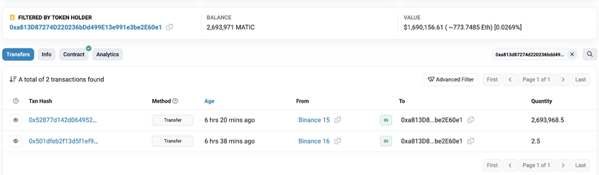 “We noticed that fresh wallets are accumulating $LINK and $MATIC. Fresh wallet “0x8eAD” withdrew 247,860 $LINK($3.5M) from #Binance in the past 2 days. Fresh wallet “0xa813” and “0x38b3″ withdrew a total of 5M $MATIC($3.13M) from #Binance.”