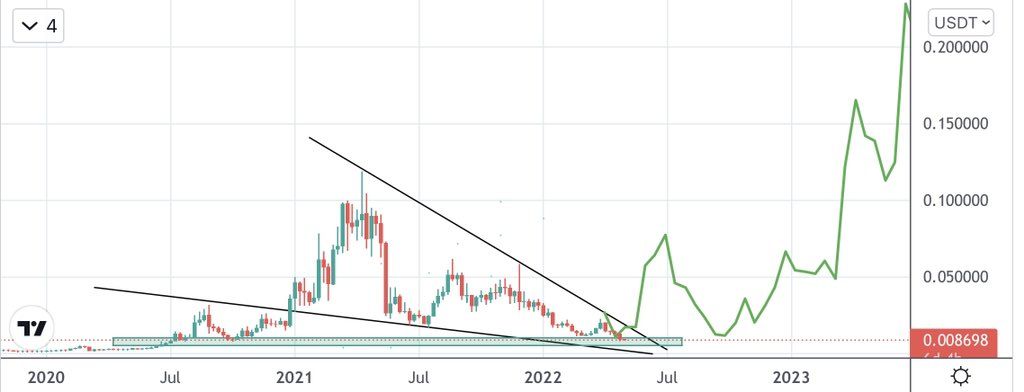 If the downward movement continues, the next closest support area would be at $0.0045, created by the 2020 highs.