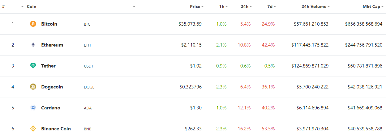 Hot on the heels of BNB, ADA, and DOGE is Ripple (XRP). XRP currently ranks seventh in market cap. The project has also seen a dramatic decline in price with the rest of the market. XRP currently sits just 3.29 Billion in market cap behind BNB.Â