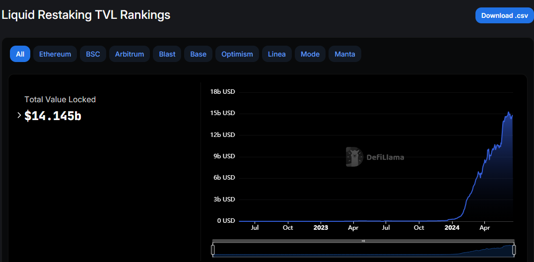 According to DefiLlama data, the liquid restaking space has a total value locked (TVL) of $14.145 billion. Growth intensified in 2024, with the TVL metric measuring the overall activity and popularity of a DeFi project.