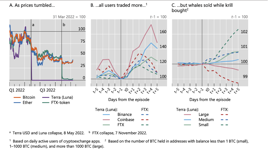 The BIS notes that despite Terra’s crash and FTX’s fall, activity on crypto trading apps jumped after news broke of their failures—but more oversized holders typically were able to “at the expense of smaller investors” as they know when to sell Bitcoin and other cryptos to retail investors before a sharp decline.