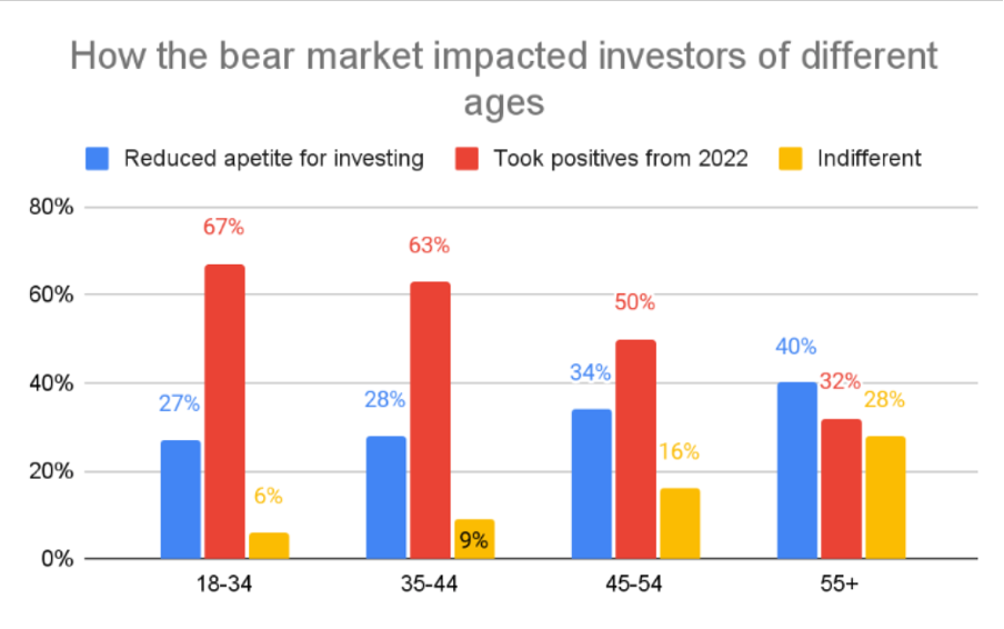 Younger investors, perhaps unsurprisingly, are less cautious than older investors. Crypto’s newness and uniqueness drove the younger generation’s optimism, despite a long-term 2022 downtrend.