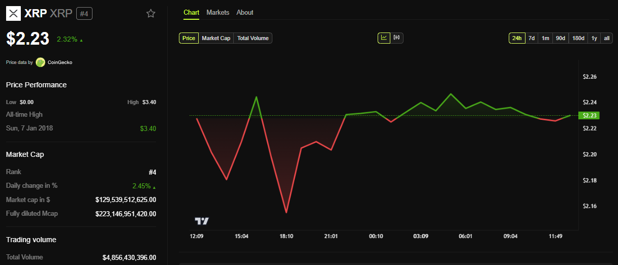 BeInCrypto data shows that XRP price was trading for $2.23 at press time. This represents a modest 2.32% in the last 24 hours.