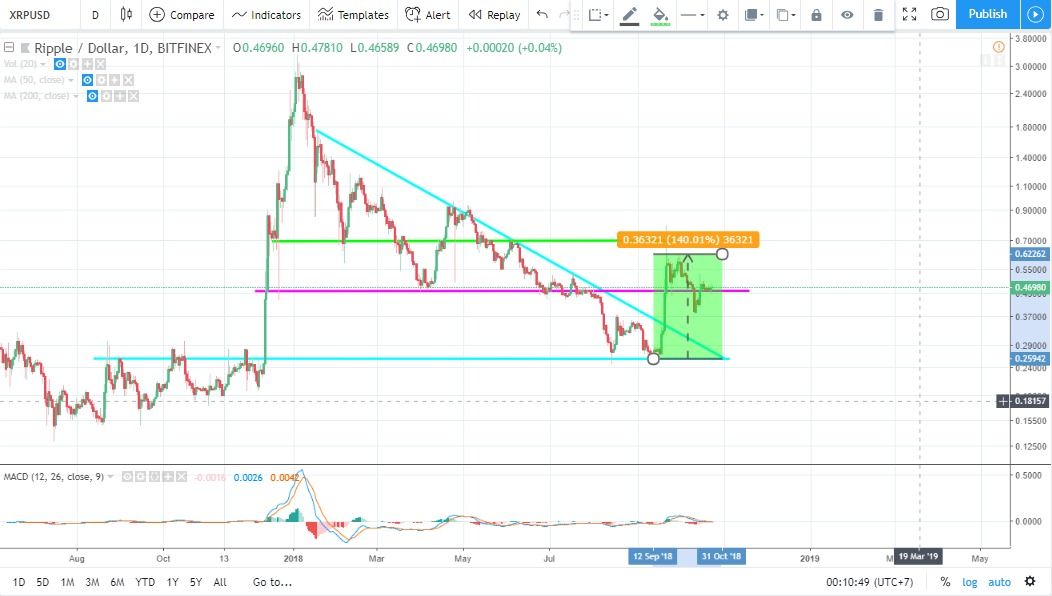 After the announcement of Ripple’s cross-border payment solution xRapid, the price launched to a peak of $0.79 before a bit of correcting back to its current price of $0.47.