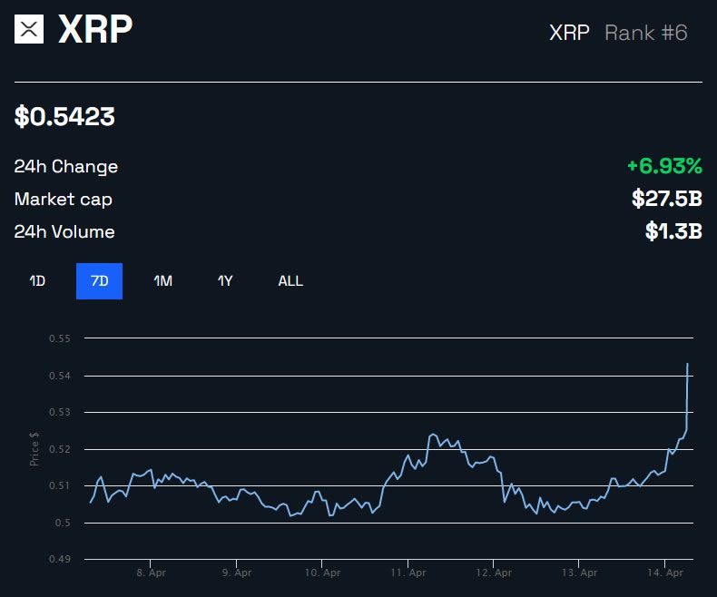 Ripple’s native XRP token climbed almost 7% on the day. As a result, XRP was changing hands for $0.542 at the time of writing.