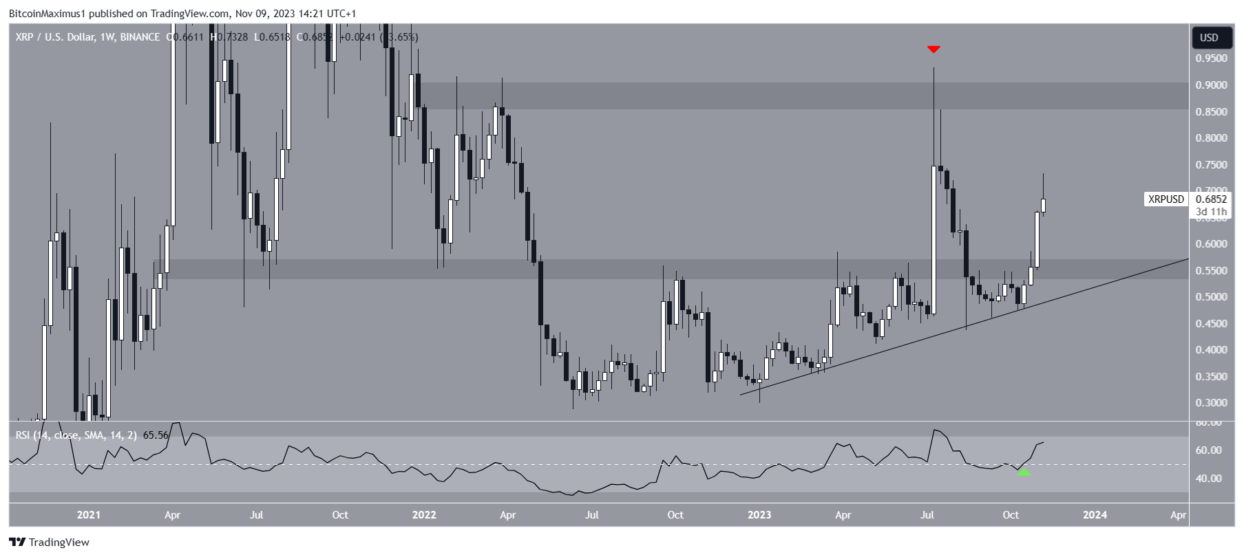XRP’s weekly technical analysis indicates a consistent price increase since June, aligning with an ascending support trend line. The price bounced off the trend line in March and peaked at $0.94 in July (red icon). The value still stands as a yearly high.