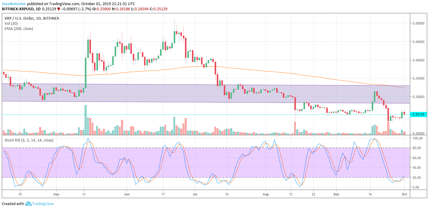 Today, Ripple’s XRP experienced a small correction to $0.25, however, the Stochastic RSI shows that it’s very oversold. This means that traders could expect a rise in the prices at least in the short term, to levels close to a zone between $0.28 and $0.30 — close to the 200 EMA.