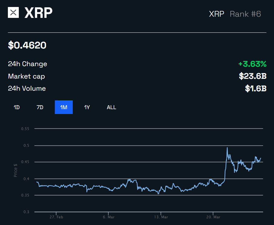 In the last 24 hours alone, XRP’s value increased 3.63% to $0.46, pushing its market capitalization to $23.6 billion, according to BeInCrypto data.