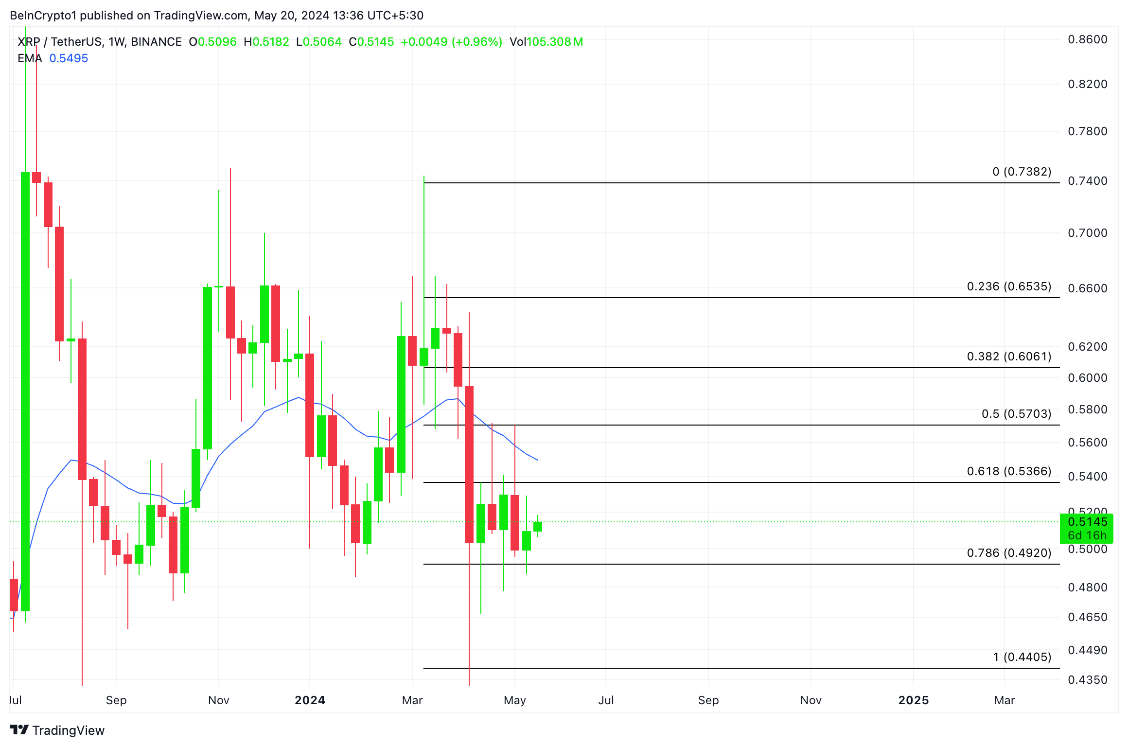 XRP currently trades below its 20-day Exponential Moving Average (EMA) at $0.51. The token’s price crossed under this key moving average on May 13, confirming the uptick in its sell-offs among market participants.
