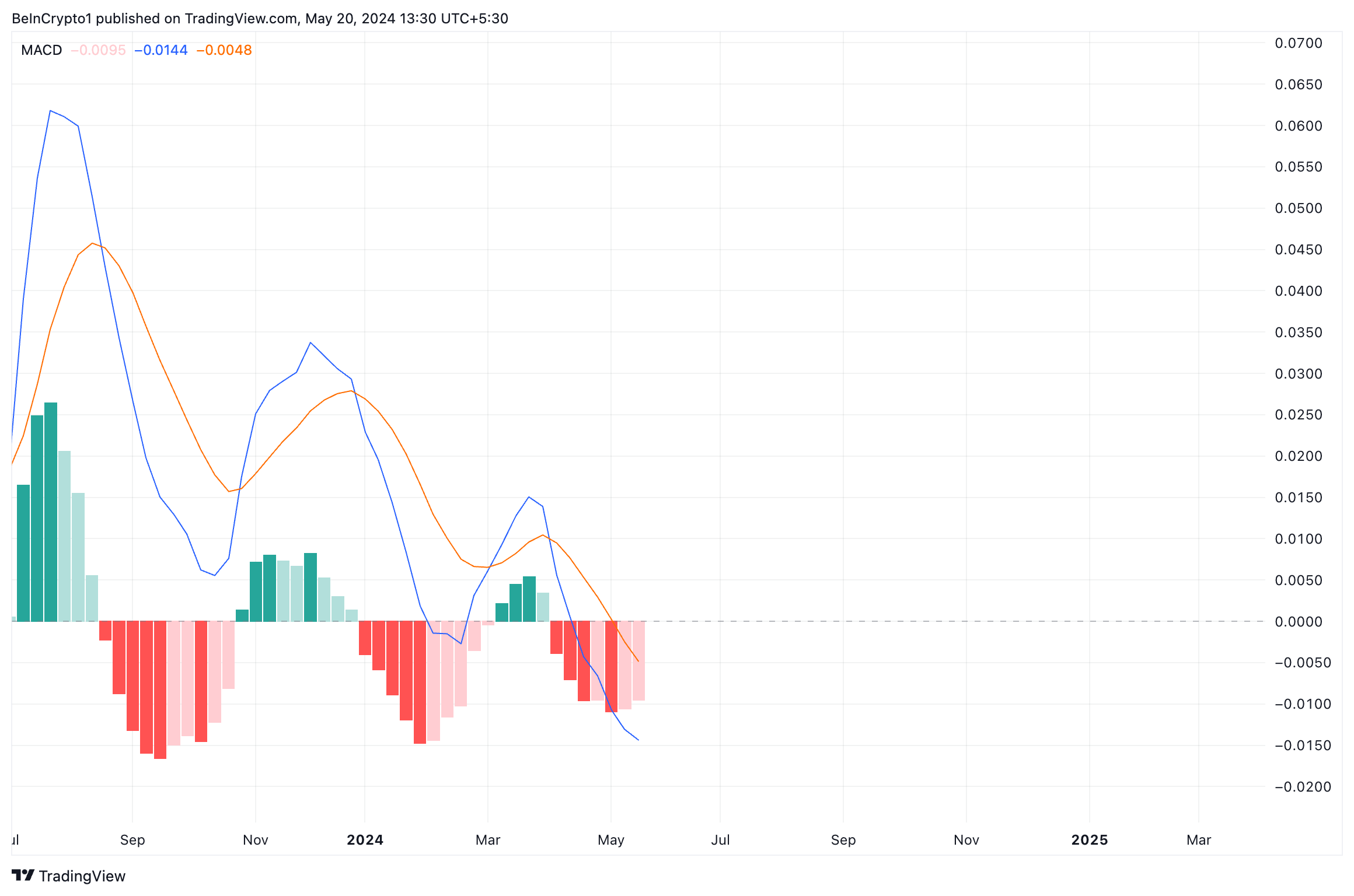 When an asset’s MACD line is positioned under its signal and zero lines, it signals that its short-term moving average has fallen below its long-term moving average. It is a bearish sign; market participants view it as a sign to exit long and open short positions.