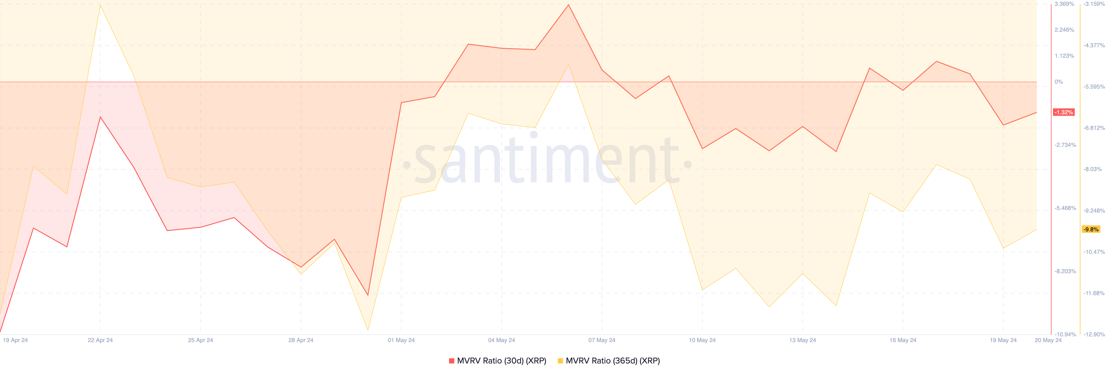 XRP’s Market Value to Realized Value (MVRV) ratio observed using 30-day and 365-day moving averages posted negative values of -1.3% and -9.8%, respectively. This may be a good buying opportunity for those looking to buy the dip and trade against current market movements.