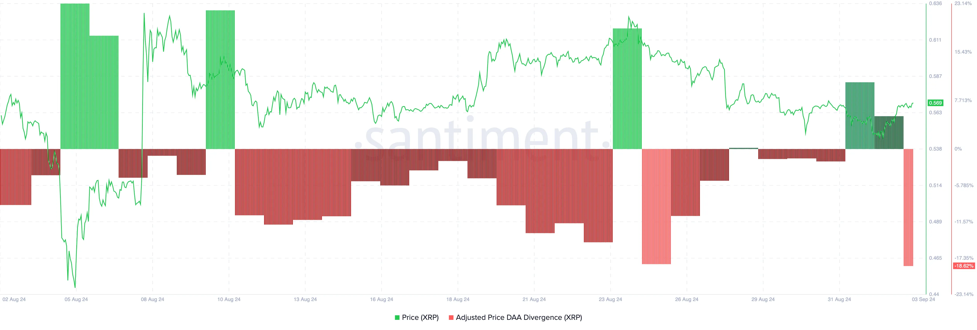 As of this writing, XRP trades at $0.56. However, the token’s Daily Active Addresses (DAA) divergence has dropped to -18.62%, indicating a decline in user engagement as the price rises.