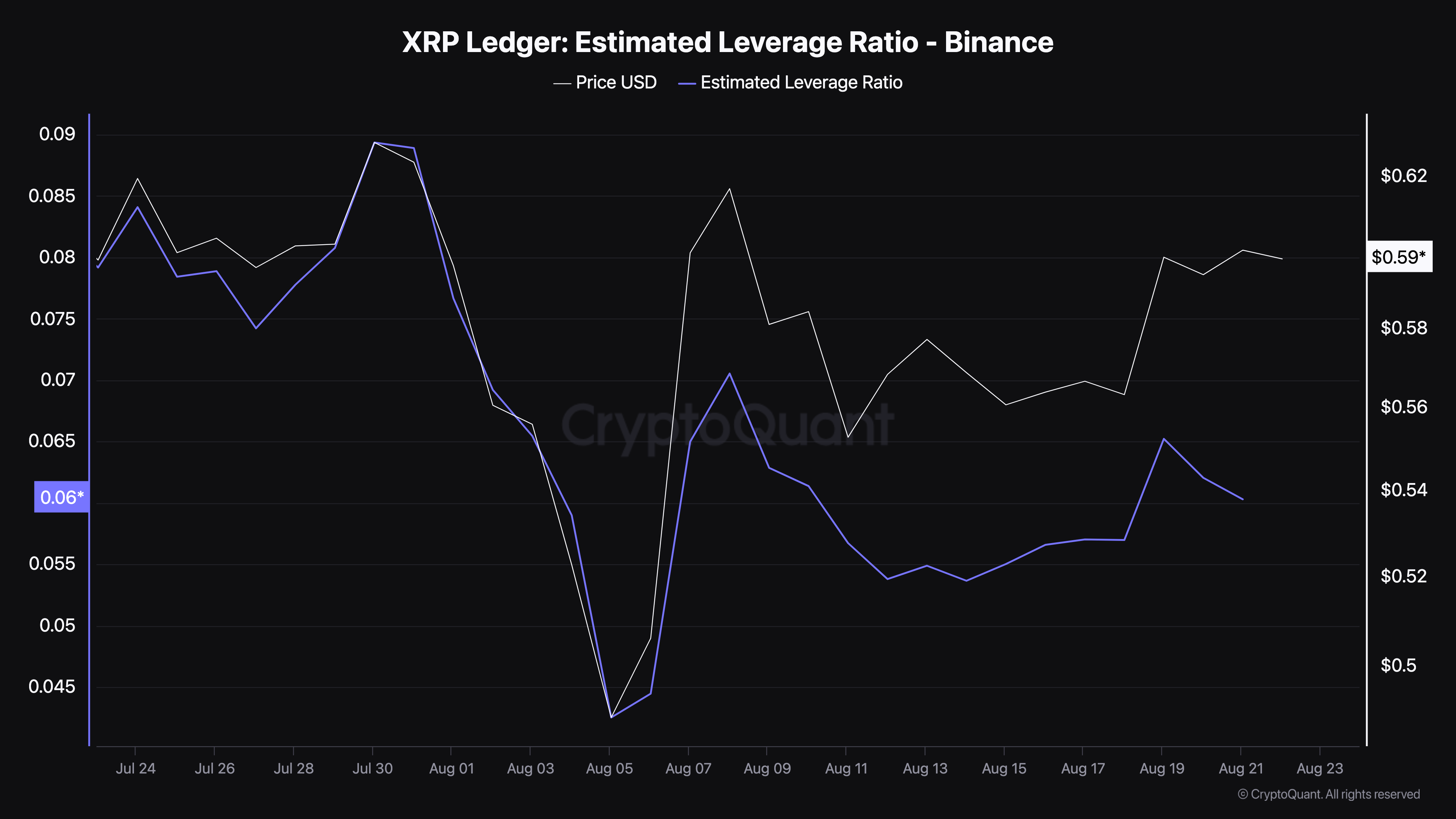 According to CryptoQuant, the XRP Estimated Leverage Ratio (ELR) is down to 0.060. As the name suggests, the ELR suggests how much leverage traders are using to bet on their positions in the market.