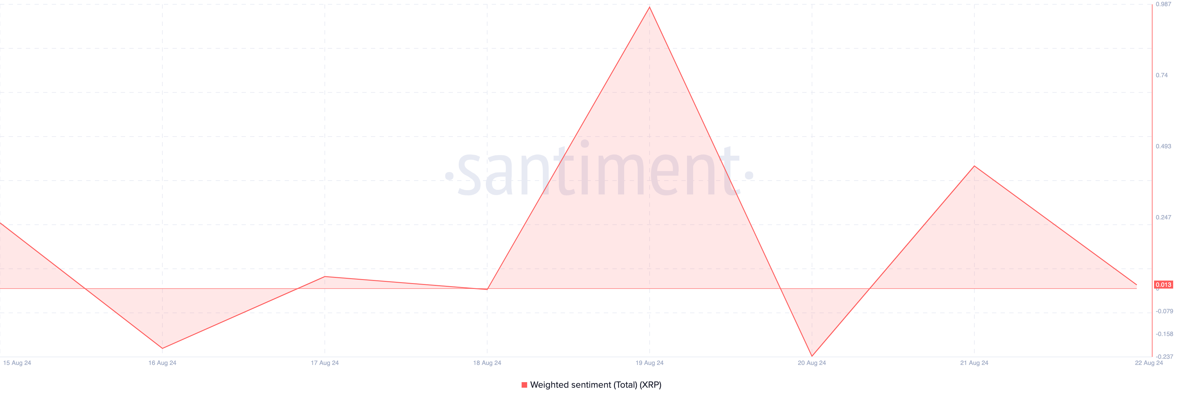 This cautious approach appears connected to XRP’s recent performance. Both traders in the derivatives market and the broader market have started to temper their bullish outlook on XRP. This shift is reflected in the Weighted Sentiment metric, provided by the on-chain analytics platform Santiment.