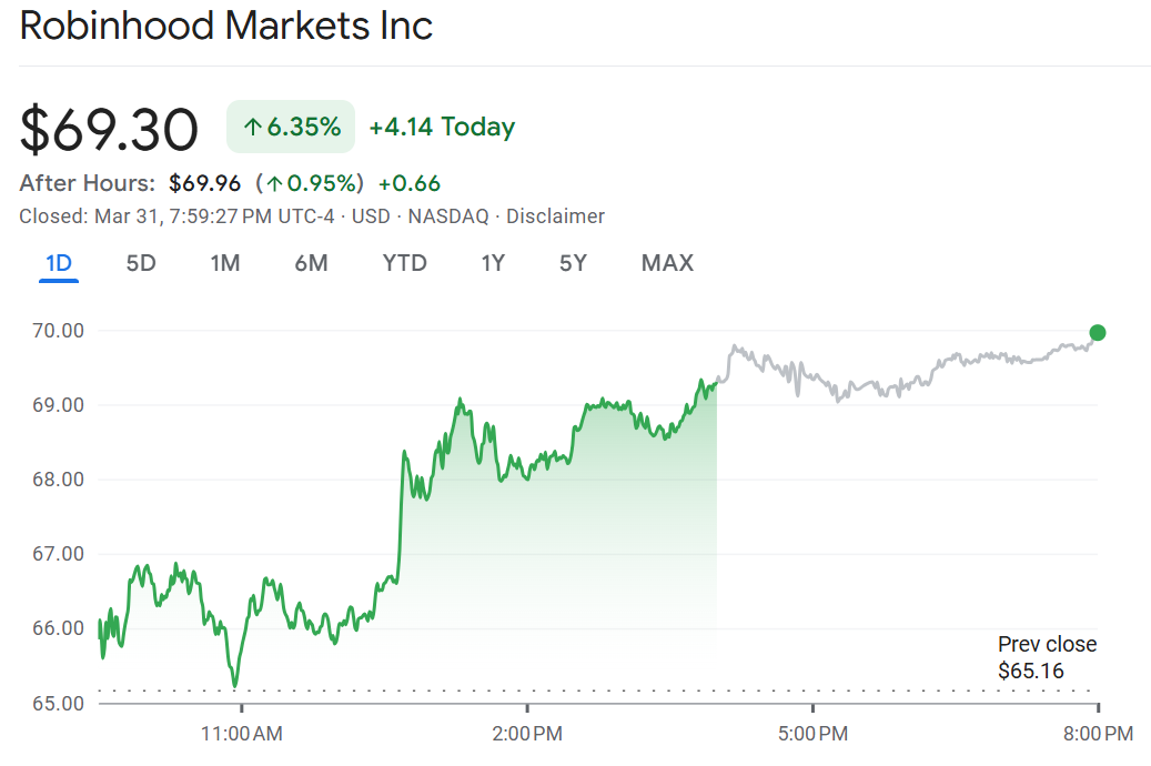 HOOD stock responded to the momentum, rising 6.35% to $69.30 on March 31, with after-hours trading pushing to $69.96.