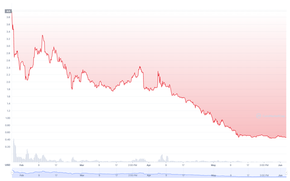 RON became a crypto trading asset in Jan 2022. It opened on Jan 27 at $3.56, reached an all-time high (ATH) of $4.32 the same day, and tested a low of $0.4275 on May 27.