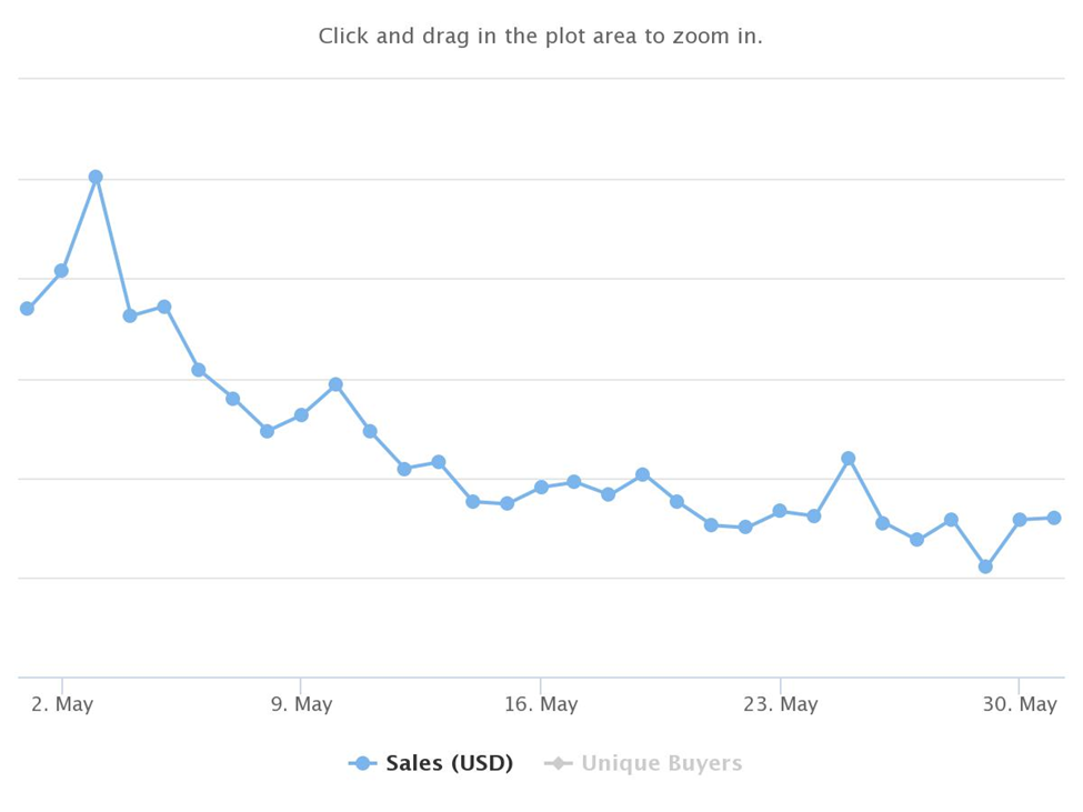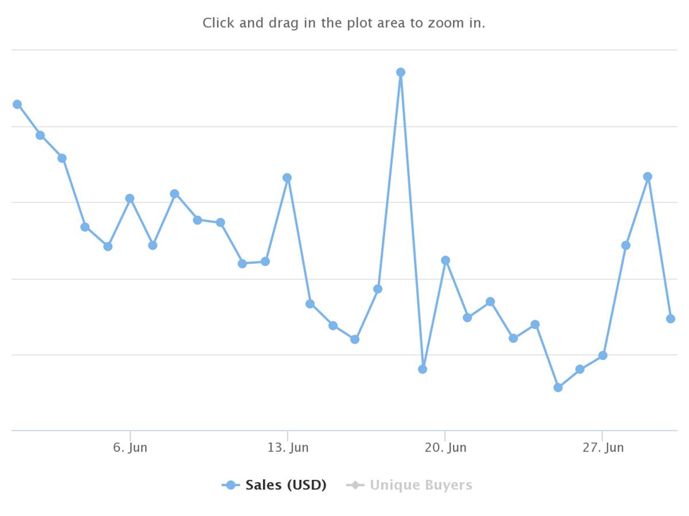 In addition to sales volume, there was a drop in average sale value. The average sale value for June was $10.33 and this was an 89% decrease from that of $97.54 recorded in Jan.