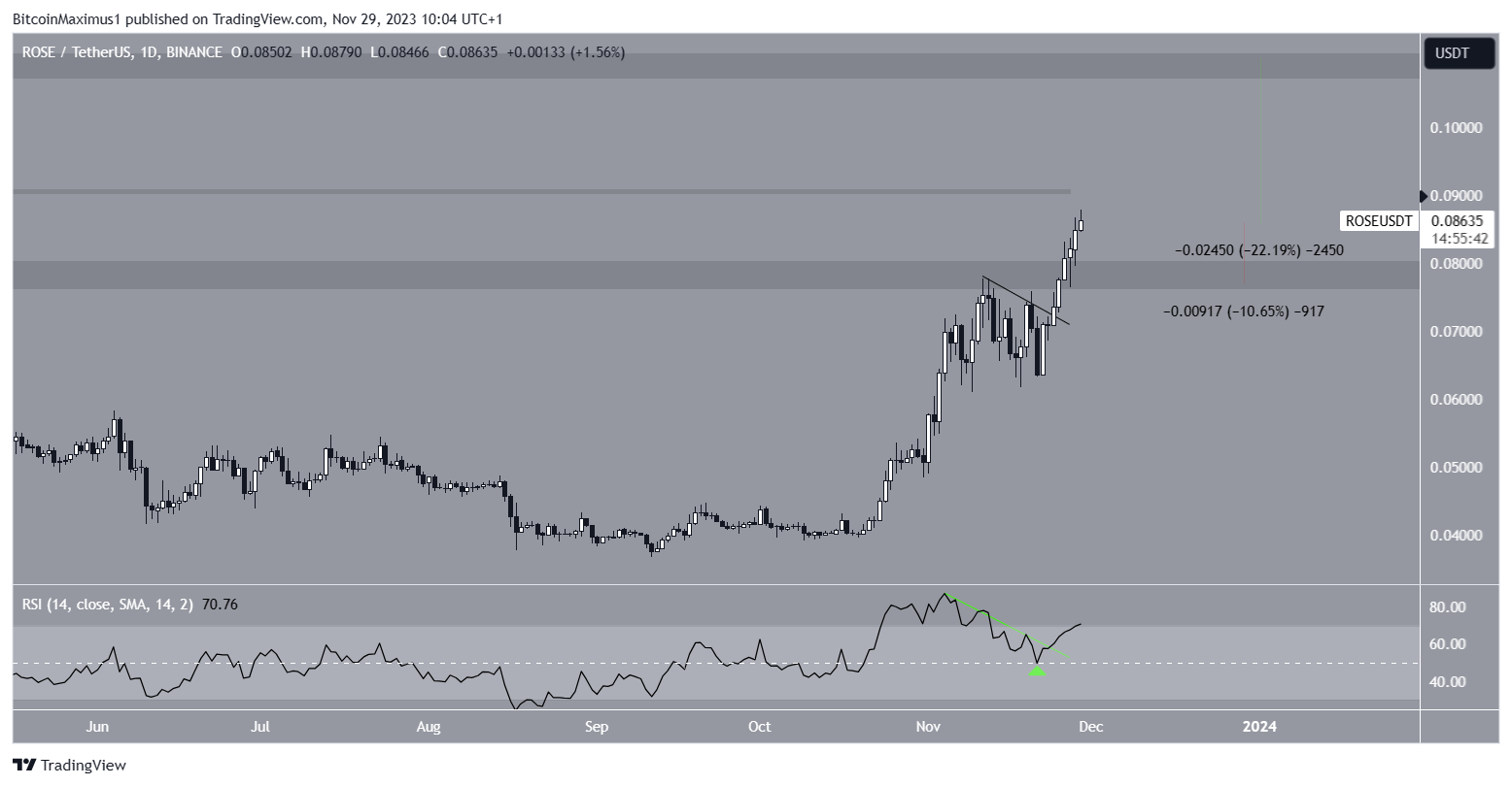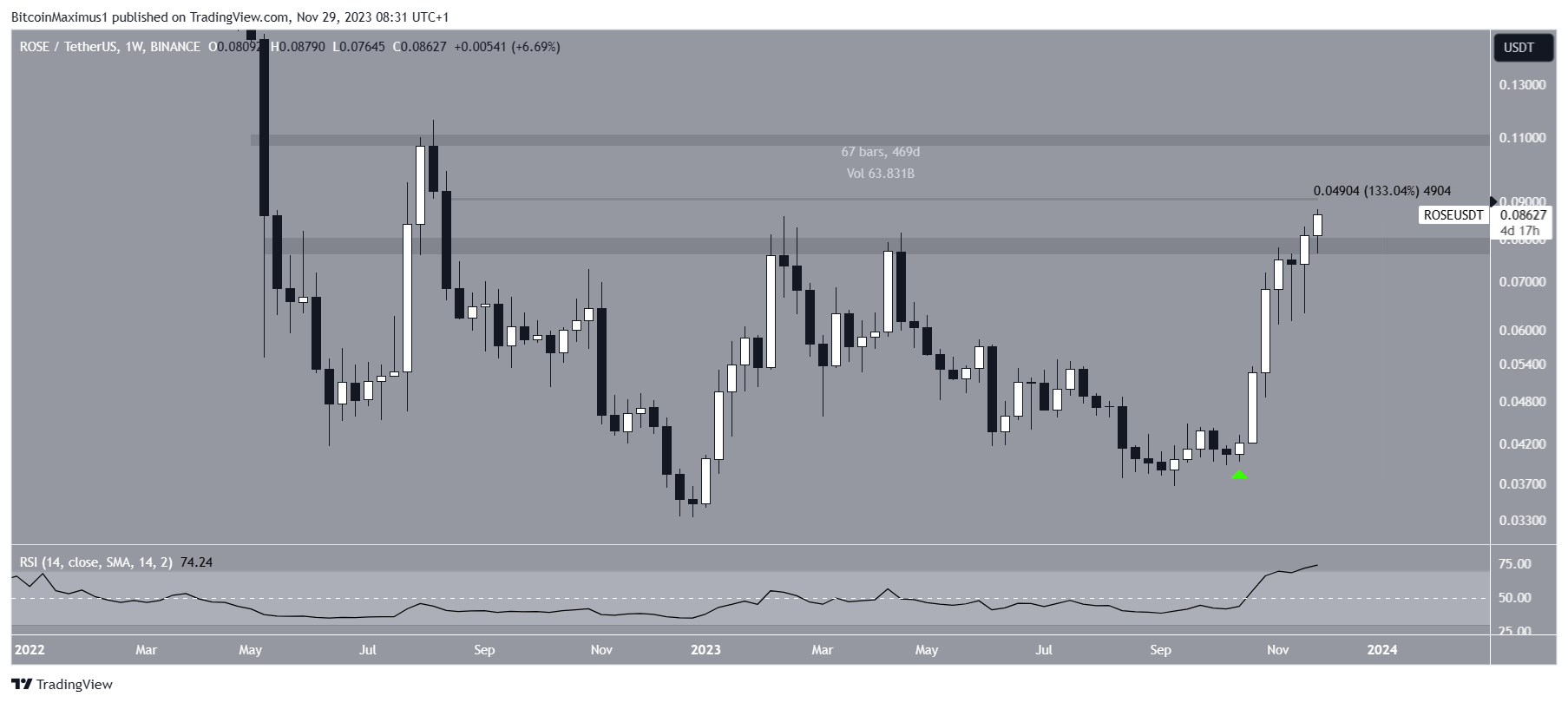 Since then, six of the seven weekly candlesticks have been bullish. This week, the ROSE price reached a high of $0.088, an increase of more than 130% since the September low, a new yearly high and the highest price in 470 days.