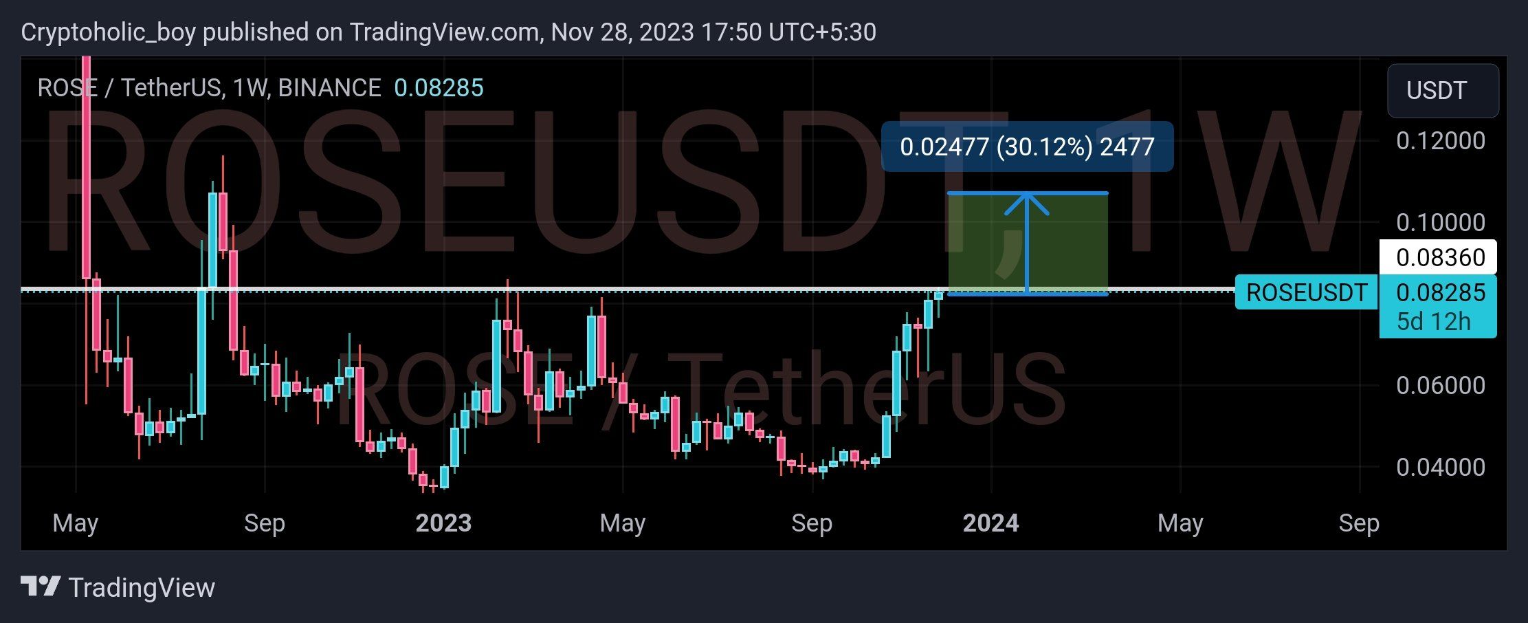 The price is approaching a pivotal horizontal resistance area in place since 2022. Will ROSE break out?