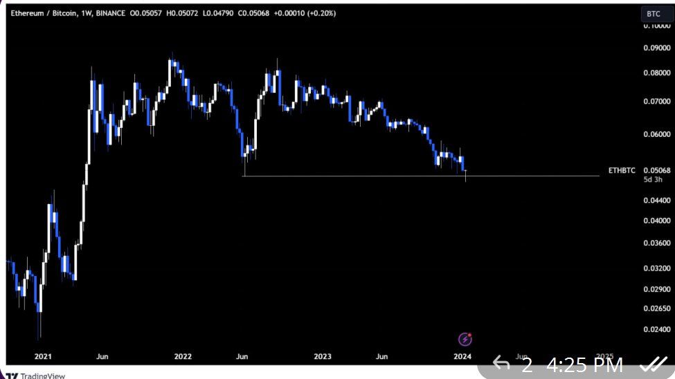 Will Clemente tweeted a chart of ETH/BTC, which shows a deviation below the 2022 lows.