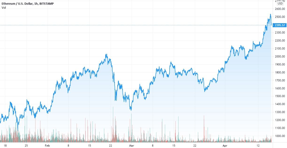 Ethereum has performed phenomenally well in the past few weeks on the back of decentralized finance (DeFi), non-fungible tokens (NFT), and the market’s general rally. The asset hit a new all-time high of over $2,500 on April 15.