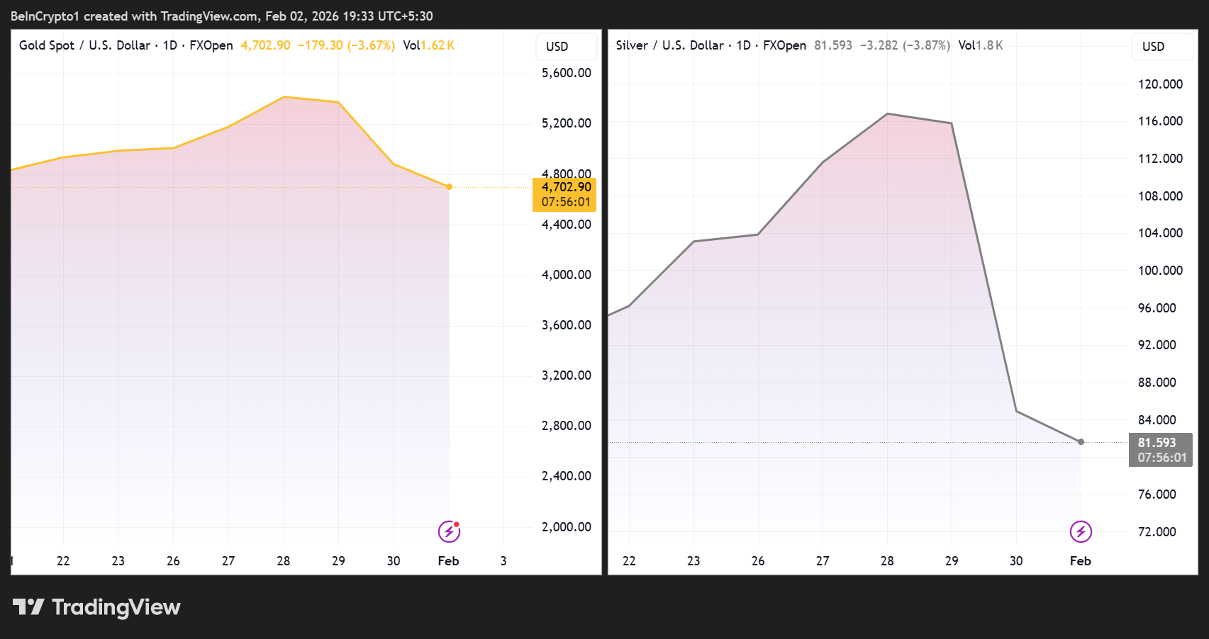 In market-cap terms, gold alone erased roughly $7.4 trillion, while silver shed another $2.7 trillion, a combined wipeout larger than the entire cryptocurrency market. As of this writing, gold was trading at $4,702, while silver was trading at $81.59.