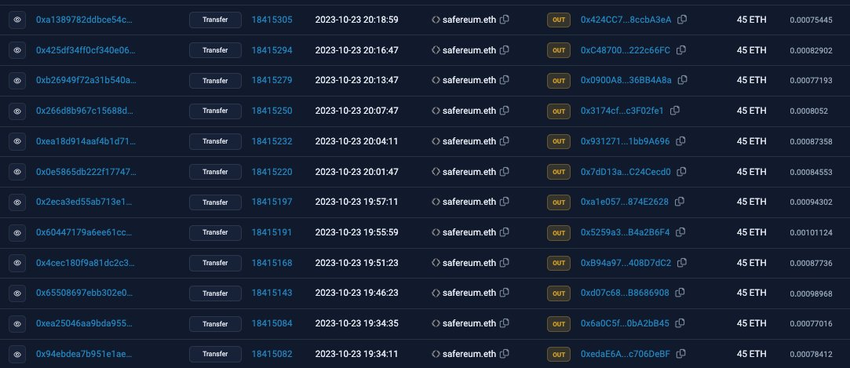 According to CertiK, the meme coin project Safereum unlocked the SAFEREUM tokens and swapped them for Ethereum ETH). Later, the address distributed ETH to various wallets in batches of 45 ETH each.