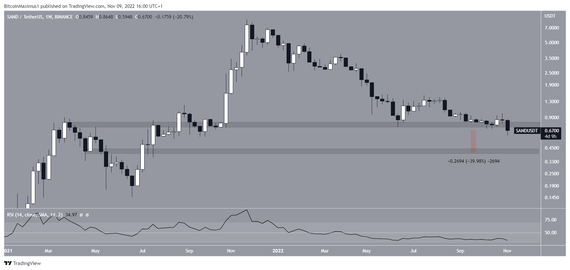 The Sandbox (SAND) price fell to a new yearly low on Nov. 8. It could continue decreasing towards the next long-term support area.