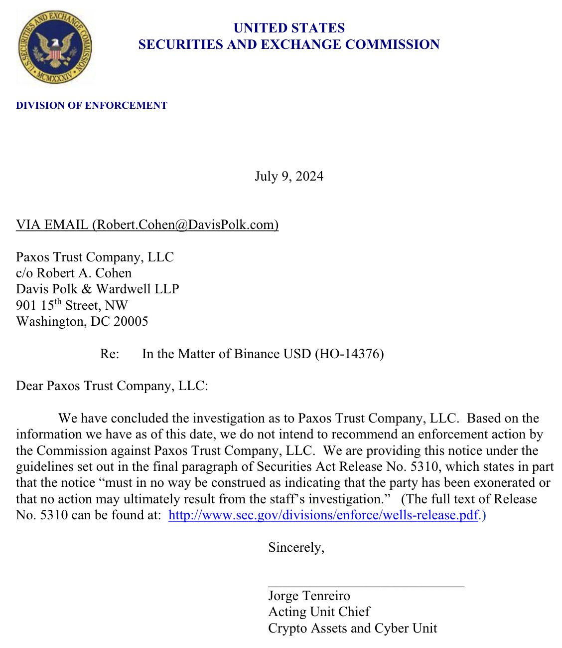 On July 9, Jorge Tenreiro, acting chief of the SEC’s crypto assets and cyber unit, told Paxos that he would not recommend enforcement action, according to a letter obtained by Fortune. This conclusion came more than a year after Paxos received a Wells notice from the SEC. The warning indicated a possible enforcement action regarding the BUSD stablecoin, issued in collaboration with Binance.