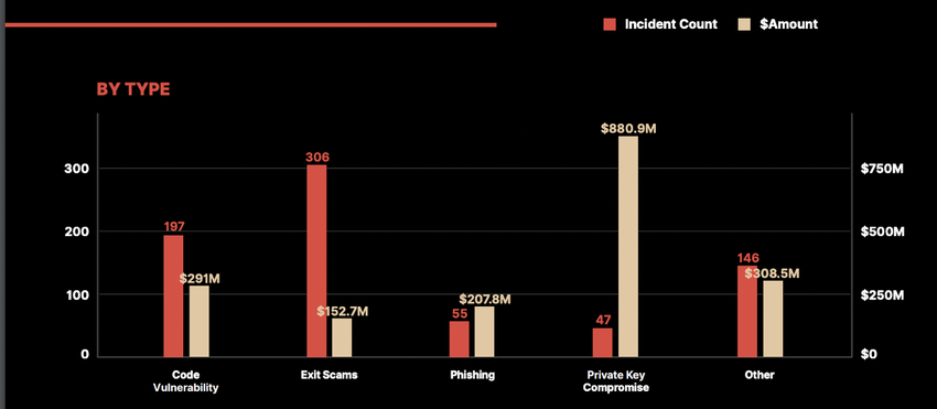The screenshot below shows that the most damage occurred due to private key compromises of all security incidents. According to the report, crypto firms lost $880.9 million as the exploiters accessed private keys.