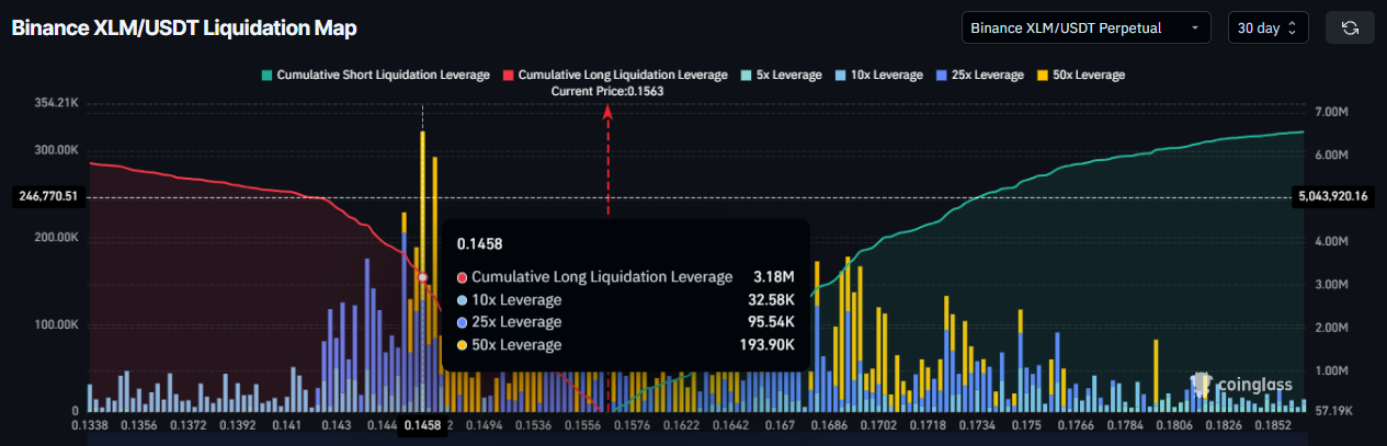 The downside risk carries a specific trigger point. Should bearish pressure push XLM below $0.145, approximately $3.18 million in long positions will face liquidation. A cascade of forced closures at that level would amplify selling pressure, further damaging bullish sentiment and potentially accelerating a sharper decline.